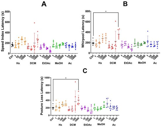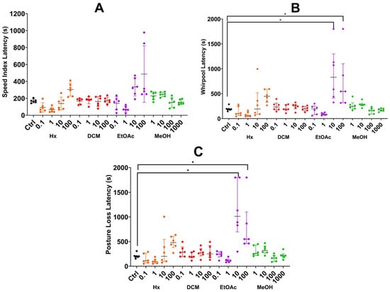 Latency metrics for zebrafish treated with Verbesina persicifolia extracts obtained by the sequential method. (A) Speed Index Latency, (B) Whirlpool Latency, (C) Posture Loss Latency. (B) (* p = < 0.01); (C) (* p = < 0.01). Data are presented as medians +- interquartile ranges. The analysis was performed using ANOVA followed by Tukey HSD.