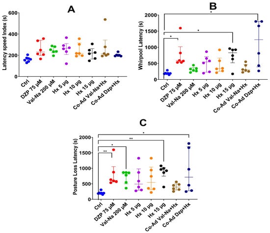 Latency metrics for zebrafish treated with Verbesina persicifolia hexane extract in combination with pharmacological controls. (A) Speed Index Latency, (B) Whirlpool Latency, and (C) Posture Loss. The administration of sodium valproate and the hexanic partition was at a concentration of 200 µM and 10 µg/mL, respectively. The administration of diazepam and the hexanic partition was at a concentration of 37.5 µM and 5 µg/mL, respectively. (B) (* p = < 0.01); (C) (* p = 0.01), (** p = < 0.01). Data are presented as medians ± interquartile ranges. For A, the analysis was performed using ANOVA followed by Tukey HSD, while for B and C, Kruskal–Wallis was used, followed by the Bonferroni correction for the Mann–Whitney U test.