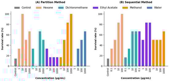 Survival rates (%) of Verbesina persicifolia extracts in zebrafish under different extraction methods. (A) Partition method: survival rates for hexane, dichloromethane, ethyl acetate, methanol, and water extracts across concentrations (1, 10, 100, and 1000 µg/mL). (B) Sequential method: survival rates for the same solvents across concentrations (0.1, 1, 10, 100, and 1000 µg/mL).