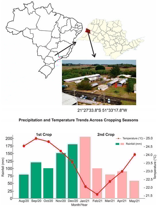 The location of the study area with geographic coordinates (on the top) and precipitation (mm) and average temperatures (°C) during the experimental cultivation period of the 1st and 2nd crop seasons in Dracena, SP, Brazil (on the bottom). Precipitation and average temperature data were obtained from the meteorological station of FCAT/UNESP (https://www.dracena.unesp.br/#!/estacao-climatologica/, accessed on 1 February 2025).