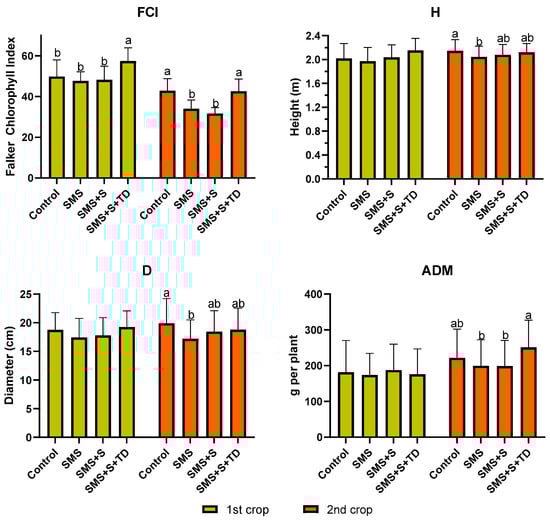 Generally, cultivation with SMS in the second crop reduced FCI by about 20% and H by approximately 7% compared to the control. The treatment with SMS + S showed intermediate development, with significant reductions only in FCI, while SMS + S + TD was statistically equivalent to the control for these variables in the second crop (Figure 2).