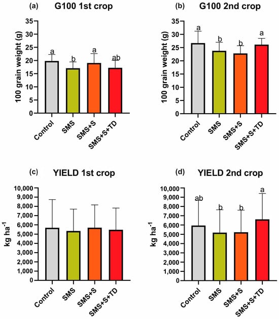 In the second crop, the treatment with complete fertilizer application (SMS + S + TD) resulted in higher G100 (26.3 g) and yield (6610.0 kg ha−1) values (Figure 3). However, no significant differences were observed in H and D values in the control when fertilizer was applied at sowing (SMS + S) (Figure 2). In particular, treatments without topdressing fertilization (SMS and SMS + S) in the second crop showed lower yields compared to SMS + S + TD, with average yields of 5189 and 5232 kg ha−1, respectively (Figure 3).