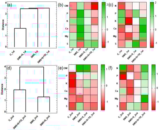 The SMS + S treatment had high soil nutrient similarity with the control (Figure 4b). The SMS treatment had elevated soil nutrients with high S absorption (Figure 4c). In the second crop, treatments with topdressing fertilizer (Control and SMS + S + TD) clustered together, highlighting the importance of optimized fertilization (Figure 4d–f).