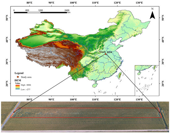 The image data for this study were collected from the primary farmland in Yuanlao Township, Shangshui County, Zhoukou City, Henan Province. The site is geographically positioned at 114°41′3.73″ E longitude and 33°27′34.53″ N latitude, based on the CGCS2000 coordinate system provided by the Beidou navigation satellite system, as shown in Figure 1. Yuanlao Township has a flat terrain, sloping from higher elevations in the northwest to lower elevations in the southeast, and is characterized by a warm temperate continental monsoon climate. This climate is marked by moderate temperatures year-round and distinct seasonal changes, making it suitable for wheat cultivation. The wheat grown in this area is winter wheat, typically planted from October to November and harvested around June of the following year. The wheat variety used in this study was Shanhe 1028, which is well-suited to the southern part of the Huang-Huai winter wheat region in Henan Province, excluding the rice-stubble wheat areas south of the Huai River in Xinyang City and parts of southern Nanyang. It is primarily cultivated in irrigated plains across this region.