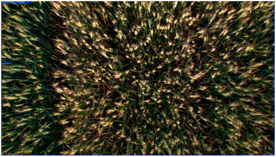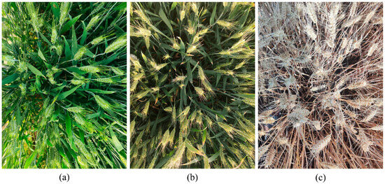 Using the Redmi K40, a total of 696 images of wheat spikes were collected, each with a resolution of 3000 × 4000 pixels and saved in .jpg format. To ensure clear image collection and the acquisition of multi-scale wheat spike information, we manually focused and captured wheat spike images at distances of 20 cm and 80 cm from the wheat spike, respectively. To maintain stable data capture and video stream detection, all images were taken from a top–down perspective. Additionally, to account for lighting variations that could affect detection results, images were captured under both cloudy and sunny conditions and at different times of the same day to ensure diversity in the wheat spike images. Sample images of raw field wheat spike captures are shown in Figure 2.