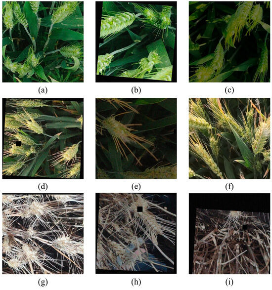 The field images were cropped and processed to enhance model training efficiency and accuracy. First, the original images were resized from 3000 × 4000 pixels to 1000 × 1000 pixels to reduce data redundancy while retaining critical information. Data annotation was conducted using the labelImg software in a Python environment configured with Anaconda. The Python version used was 3.8, while the labelImg version was 1.8.6. The annotations were saved in the PASCAL visual object class (VOC) format as .xml files, with three designated categories: “flowerwheat”, “fillingwheat”, and “ripewheat”. The dataset was augmented using various image enhancement techniques to improve the model’s generalization and robustness. Specific augmentation methods included adding random noise, adjusting image brightness, random occlusion of parts of the images, image rotation, cropping, translation, and mirroring. Samples of the augmented images are displayed in Figure 3.