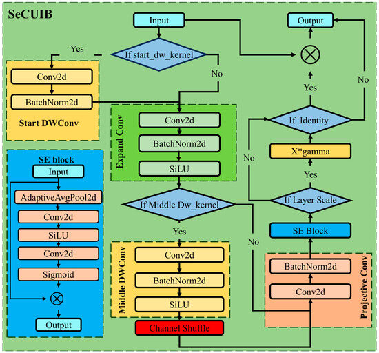 The main computational steps of the SeCUIB module can be divided into the following stages: initial depthwise convolution, expansion convolution, intermediate depthwise convolution, channel shuffling, projection convolution, SE attention mechanism, and residual connection.