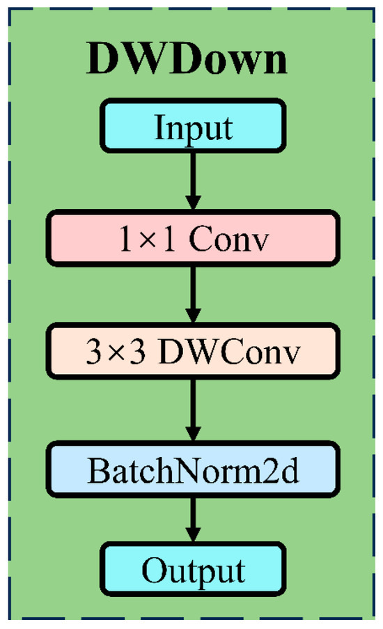 The downsampling module plays a crucial role in object detection networks. Downsampling is achieved through convolutional layers, typically using convolution operations with a stride of 2 to reduce high-resolution feature maps to lower resolutions, facilitating fusion with smaller-scale feature maps. At the same time, the reduction in feature map size helps decrease the model’s computational load and memory requirements. To improve computational efficiency and feature extraction capability, this study proposes a lightweight downsampling module named DWDown. The structure of the DWDown module is shown in Figure 5.
