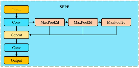 The Spatial Pyramid Pooling Fast (SPPF) module is used in object detection networks to enhance feature extraction, particularly for handling targets at different scales. The structure of the SPPF module is shown in Figure 6. It performs multi-scale pooling on the input feature map to extract a broader range of features while maintaining computational efficiency [44,45]. Specifically, the SPPF module first reduces the number of channels in the input feature map by half, then performs three separate max-pooling operations at different scales and concatenates the results with the original feature map. Finally, a convolutional layer is used to integrate these multi-scale features into a unified feature map.