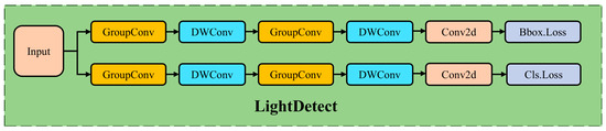 In this study, a new lightweight detection head (LightDetect) is designed based on the YOLOv8 detection head. The aim of this design is to reduce the computational burden of the model while maintaining detection performance. The improvement combines group convolutions and depthwise separable convolutions. The structure of the lightweight detection head is shown in Figure 7. LightDetect achieves efficient and accurate object detection through a carefully designed network structure, which consists of two main branches: one for bounding box regression prediction and another for class classification prediction.