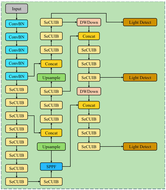 As seen in Figure 8, we selected a small-scale version of MobileNetV4 as the base network structure to ensure both the lightweight nature and efficiency of the model. We also optimized the UIB module and constructed a new SeCUIB module to rebuild the backbone network, combining it with SPPF to enhance the feature recognition and extraction capabilities for wheat spikes. The SeCUIB and DWDown modules were used to build the FPN + PAN neck network. Finally, a lightweight head network, LightDetect, was built by combining grouped convolutions and depthwise convolutions.