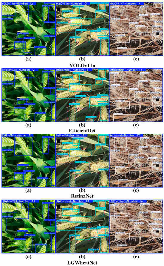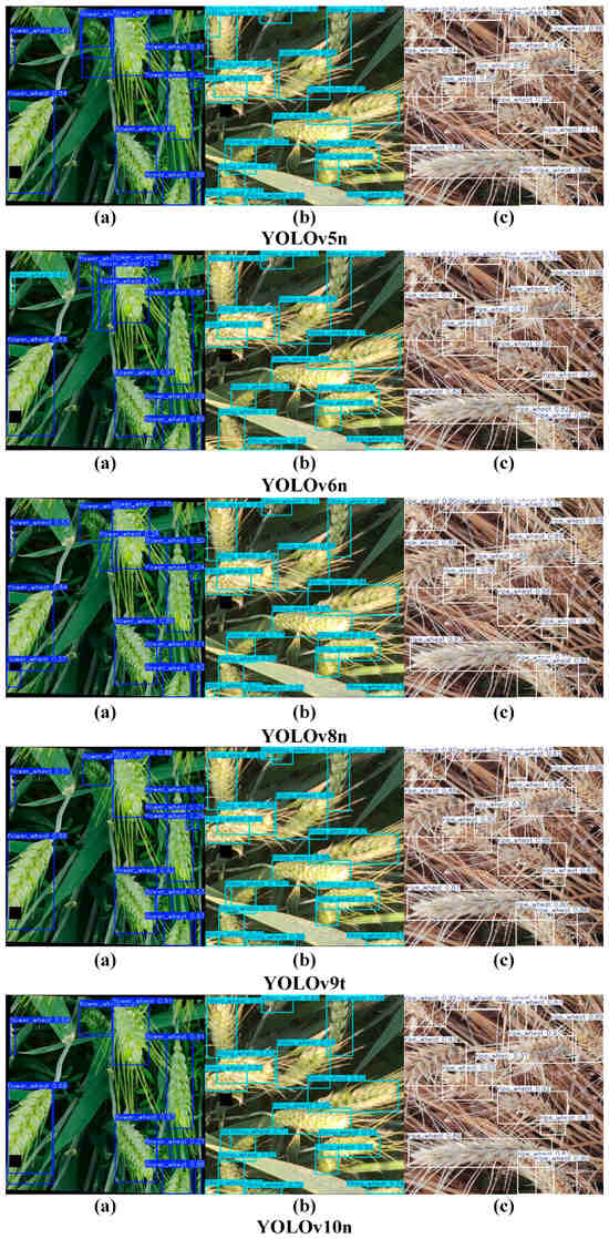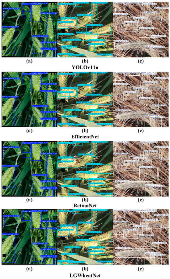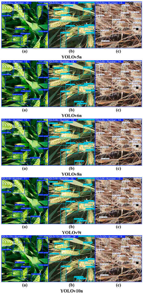 With advancements in image processing technology, researchers have begun exploring automated wheat spike detection and counting by analyzing field images, significantly enhancing efficiency and accuracy [9]. Zhou et al. [10] developed a method using red–green–blue (RGB) images based on light intensity selection. By employing image segmentation, superpixel theory, and multi-feature optimization, along with the TWSVM-Seg model, they achieved rapid and accurate wheat spike counting. Fernandez-Gallego et al. [11] used thermal imaging technology to develop an automated image processing system, which leveraged contrast enhancement and filtering techniques to separate wheat spikes from other parts of the crop canopy based on temperature differences, enabling automatic wheat spike counting under field conditions. Hong et al. [12] introduced the CTHNet network, a hybrid attention network that integrates local features and global contextual information, designed for accurate wheat spike counting from RGB images. While image processing-based object detection methods offer advantages in real-time performance, interpretability, and reduced data annotation requirements, they exhibit notable limitations in terms of generalizability, feature robustness, detection precision, and adaptability. These constraints mean that when faced with complex real-world conditions, such methods typically underperform compared to deep learning approaches, limiting their applicability in broader scenarios [13,14].
