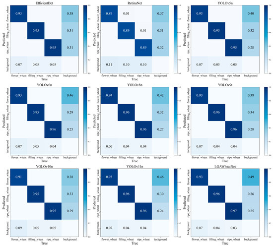 Finally, the dataset was randomly divided into three parts: training, validation, and test sets, with a ratio of 8:1:1. For the flowering stage, the test set contained 4380 samples, the training set 19,728 samples, and the validation set 3728 samples. In the filling stage, the test set contained 3570 samples, the training set 16,082 samples, and the validation set 3363 samples. For the maturity stage, the test set contained 3611 samples, the training set 17,254 samples, and the validation set 3730 samples.