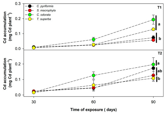 | Time (DAEs) | Cd | C. pyriformis | S. macrophilla | C. odorata | T. superba | |
