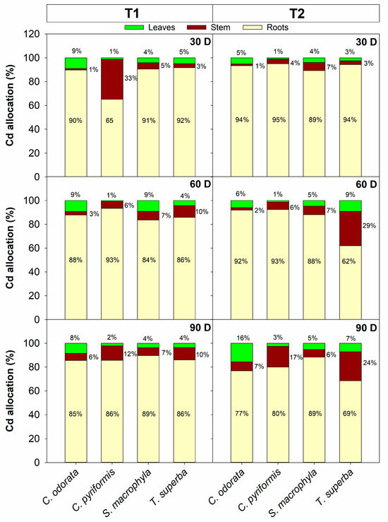 2.2. Cariniana pyriformis and Terminalia superba Showed Hyperaccumulation and Marked Allocation of Cadmium to the Stem