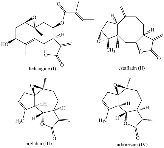 This effect, called allelopathy, is of great importance in agriculture for pest control, provided that a correct association is established between the species producing allelopatic substances and the cultivated species [22,23]. Sesquiterpene lactones such as estafiatin, arglabin, arborescin, and heliangine serve as examples of compounds with allelopathic effects, producing chemicals that negatively impact the growth and development of competing plants [20] (Figure 1).