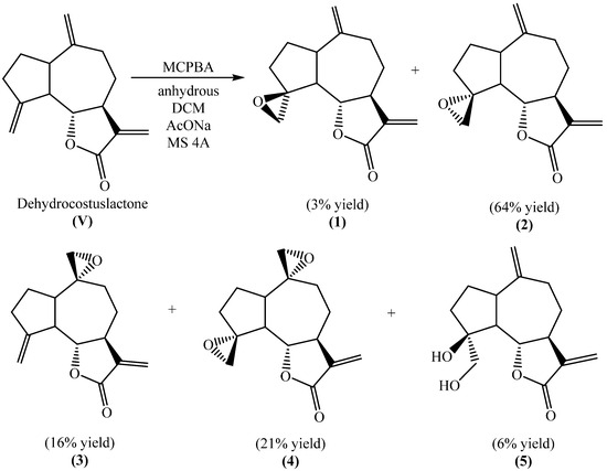 For the study of the herbicidal activity of sesquiterpene lactones, new epoxy derivatives were synthesized from dehydrocostus lactone (DHC, V), yielding derivatives (1), (2), (3), (4), and (5). These compounds were obtained from the reaction of DHC with meta-chloroperbenzoic acid (MCPBA) in anhydrous DCM, with yields of 3%, 64%, 16%, 21%, and 6%, respectively, as shown in Figure 2.
