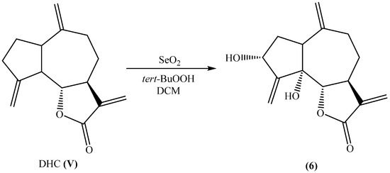 As previously described, compound 5 was also utilized in the synthesis of 5α-hydroxy-isozaluzanine C (6) through a dihydroxylation reaction. This transformation was carried out using DHC as the starting material, with selenium oxide and tert-butyl hydroperoxide serving as the key oxidizing agents. The reaction conditions were carefully controlled to promote selective oxidation, leading to the formation of the hydroxylated product. This method provides an efficient approach to modifying the molecular structure, potentially enhancing its biological activity. The reaction pathway and structural changes involved in this transformation are illustrated in Figure 3.