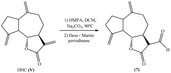 The formation of 13-oxo-epi-costuslactone (7) involved a two-step synthetic process starting with the reaction of DHC with aqueous sodium carbonate in hexamethylphosphoramide (HMPA). Following this transformation, the primary alcohol underwent oxidation using Dess–Martin periodinane, a mild and selective oxidizing agent commonly employed for converting primary alcohols to aldehydes. This oxidation step was crucial for achieving the desired structural modification, ultimately leading to the formation of 13-oxo-epi-costuslactone (Figure 4).