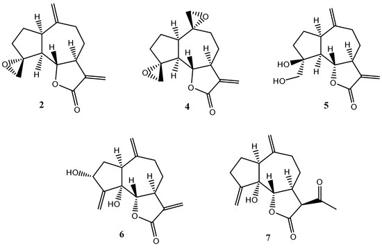 The sesquiterpenic lactones, one of the largest families of natural products, are compounds widely distributed in plants and more than 7000 structures of this class have already been described [9,10]. In addition, studies referring to these compounds indicate that they have a broad biological potential, standing out in terms of cytotoxic, antitumoral, antibacterial, anti-inflammatory, antimalaric, and antifungal activities [11,12,13,14].