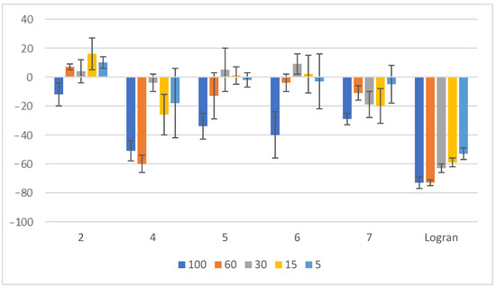 No significant changes were observed for the compounds tested when compared to the length of the stem of L. sativa. However, upon further analysis, as illustrated in Figure 11, it was verified that compound 5 had a notable inhibitory effect on radicle growth. Specifically, at a concentration of 100 μM, compound 5 reduced radicle length by 28%, making it the most significant change observed among all tested compounds. This suggests that compound 5 exhibits a measurable impact on early seedling development, potentially affecting root elongation more than stem growth. Compounds 4, 6, and 7 presented stimulatory effect on the growth of lettuce. These three compounds stimulated almost 40% the growth of the radicle of L. sativa.