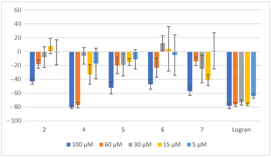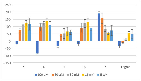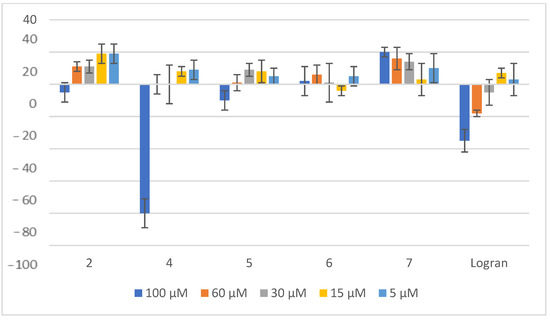 Effect of compounds 2 and 4–7 on the radicle length of L. sativum. Radicle length of seedlings from garden cress seeds exposed to aqueous 0.1% (v/v) DMSO solutions of compounds at different concentrations. Controls consisted of deionized water with the same concentration of DMSO. Values are expressed as percentage difference from the negative control, calculated as: shoot length (%) = [(length − length of negative control)/length of negative control] × 100. Error bars represent the standard deviation.