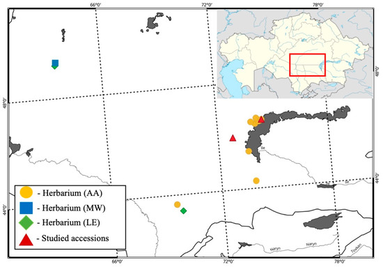- Kubentayev, S.A.; Alibekov, D.T.; Perezhogin, Y.V.; Lazkov, G.A.; Kupriyanov, A.N.; Ebel, A.L.; Izbastina, K.; Borodulina, O.; Kubentayeva, B.B. Revised checklist of endemic vascular plants of Kazakhstan. PhytoKeys 2024, 238, 241–279. [Google Scholar] [CrossRef] [PubMed]