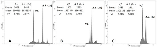 - Doležel, J.; Sgorbati, S.; Lucretti, S. Comparison of three DNA fluorochromes for flow cytometric estimation of nuclear DNA content in plants. Physiol. Plant. 1992, 85, 625–631. [Google Scholar] [CrossRef]
