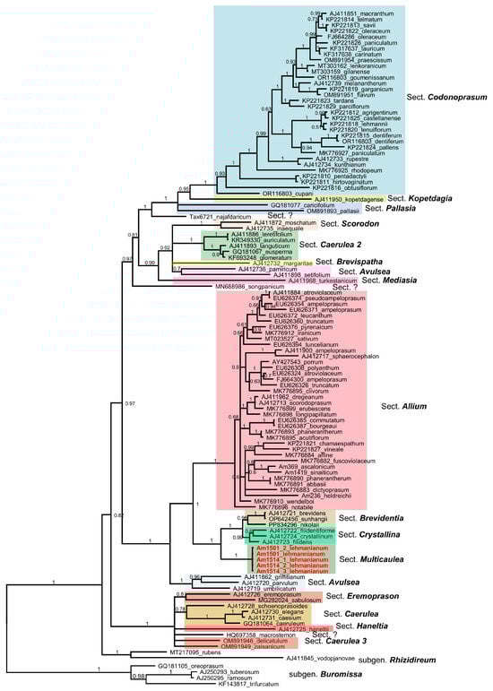 - Friesen, N.; Herden, T.; Leweke, M.; Grützmacher, L.; Fragman-Sapir, O.; Hurka, H.; Frank, R.; Blattner, F.R.; Fritsch, R.M. Dated phylogeny, phylogeography, and classification of Allium subgenus Amerallium (Amaryllidaceae) from the Old World, based on six DNA fragments. Taxon 2024, 73, 971–991. [Google Scholar] [CrossRef]