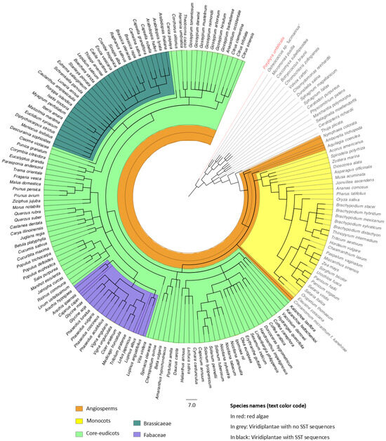Apart from the SSTs in Brassicaceae and Fabaceae, 97 additional sequences (Table S1) were identified in 72 species from 37 core eudicot families (List S1) (light green in Figure 1). SST sequences were not found in red algae (in red in Figure 1), nor in chlorophytes or bryophytes. Within vascular plants, they were only present in core eudicots (light green in Figure 1) (species where SST genes were not found are shown in grey). In fact, among angiosperms (orange in Figure 1), they were absent in Amborellales (Amborella trichopoda Baill.) and Nymphaeales (Nymphaeae colorata Peter), both classified as the most ancient basal angiosperms; Ranunculales (Aquilegia coerulea James), a basal eudicot; monocots (yellow in Figure 1); and Laurales (Cinnamomum micranthum Hayata), a less-evolved angiosperm of the Magnoliids group.