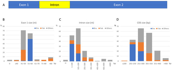 Structure and characteristics of the canonical SST gene. (A) The SST genes have two exons and one intron close to the 5′ end. (B) Percentage distribution of exon 1 length in the different families. (C) Percentage distribution of intron size in the different families. (D) Percentage distribution of the complete CDS size. The numbers indicate the length in bp, and the results have been represented by the three groups of families established in this analysis: Brassicaceae (Bra, blue), Fabaceae (Fab, orange), and Other families (Other, grey).