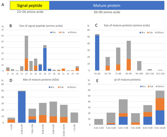 Structure and characteristics of the canonical SST protein. (A) Representation of the SST protein domains: the signal peptide and the mature protein, indicating the most frequent sizes. (B) Percentage distribution of the signal peptide size in the different families. (C) Percentage distribution of mature SST size across families. (D) Percentage distribution of the molecular weight (Mw) grouped by families. (E) Percentage distribution of the in silico calculated pI. The results have been represented by the three groups of families established in this analysis: Brassicaceae (Bra, blue), Fabaceae (Fab, orange), and Other families (Other, grey).
