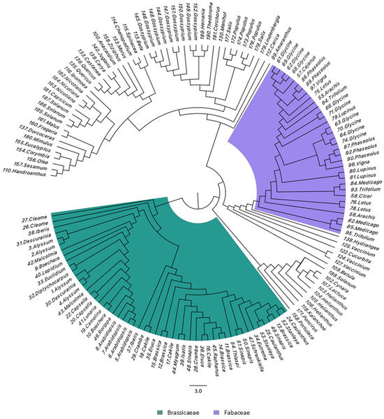 The dendrogram using the 151 sequences (List S4) showed that SSTs from Brassicaceae (green) and Fabaceae (purple) were split into two groups according to their taxonomic classification (Figure 4). It is interesting to note that Cleome violacea appears on the margin of the Brassicaceae, which agrees with some classifications that include this genus in the family Cleomaceae, also in the order Brassicales.