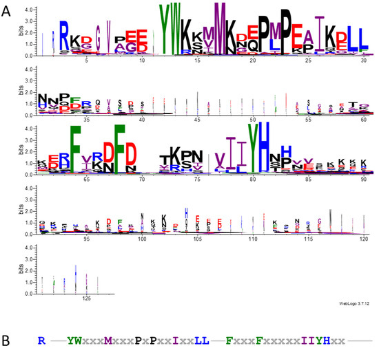 Given that the similarity was greater between members of the same family, we separately obtained the multiple sequence alignments of the Brassicaceae, Fabaceae, and Other families (Figure 6A–C and Figure S2B–D, respectively). In Cruciferae, the SST sequence was extremely conserved, with single amino acids prevailing at most positions (Figure 6A and Figure S2B). All the proteins had similar lengths; hence, the alignment contained few gaps, as can be observed in the WebLogo representation using a width scale (Figure 6A). The main difference among SSTs from Cruciferae was the number of amino acids from the initial R to the conserved Y (Figure 5A), which ranged between 5 and 10 in the different sequences (Table S1). Notably, a third conserved F close to the other two referred to above occurred (Figure 6A).