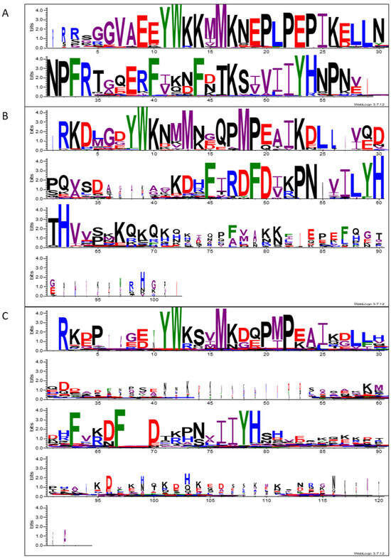 WebLogo of the mature SST proteins with scaled stack width sorted by taxonomic family. (A) Brassicaceae. (B) Fabaceae. (C) Other families. The characteristics of the WebLogo are detailed in the legend of Figure 5.