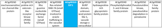 To obtain empirical results for the SST family of proteins, we focused on the SST1 gene (At1g49310) of Arabidopsis, the only gene encoding an SST protein in this species. Sometimes the genetic situation of a gene allows us to infer possible interactions and/or functions. The environment of the SST1 gene has been analysed using the JBrowse database [57,58] (Figure 8). The genes immediately flanking SST1 upstream and downstream encode a Ras-related RAB-7A (RABG3E) (At1g49300) and a BURP protein named unknown seed protein like 1 (USPL1) (At1g49320), respectively. Other genes up- and downstream of SST1 are shown in Figure 8 and encode proteins related to cell signalling, such as the mechanosensitive ion channel-like protein, proline-rich extensin-like receptor kinase (PERK) family, phosphatidylinositol 3 and 4-kinase family protein, pseudo uridine kinase, and F-box family protein. Also, we found a gene encoding a cell-wall hydroxyproline-rich glycoprotein that might be related to the above-mentioned PERK. The genomic environment of the genes encoding the ST and SST proteins of M. truncatula is included in Figure S4 as the results will be used to support the discussion.