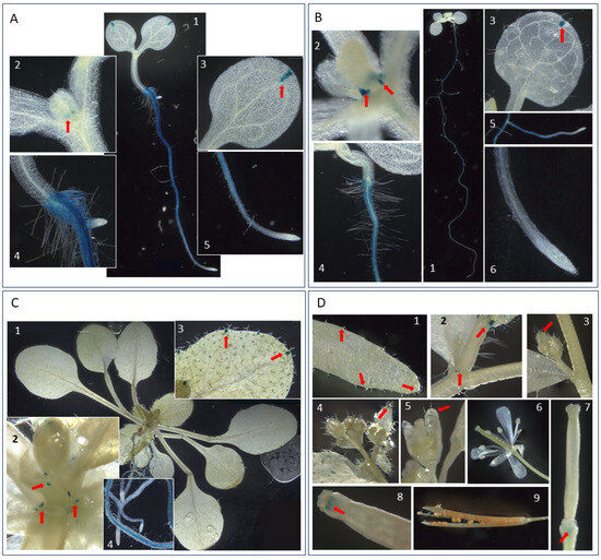 GUS activity of pSST1::GUS transgenic Arabidopsis thaliana plants. (A) 5 d old seedling (1), detail of the shoot apex (2), a cotyledon (3), the junction zone between the hypocotyl and the radicle with a lateral root (4), and the root apex (5). (B) A 10 d old plantlet (1), detail of the shoot apex (2), a cotyledon (3), the junction zone between the hypocotyl and the radicle (4), a lateral root (5) and the root apex (6). (C) A 20 d old plant (1), detail of the shoot apical zone (2), leaf (3), and root apices (4). (D) Organs of plants older than 30 d: cauline leaf (1), branch insertion zone (2), floral bud (3), flowers at different stages of development (4), flower before fertilisation (5), flower after fertilisation (6), immature silique (7), detail of immature silique tip (8), and mature silique (9). The red arrows show the areas with GUS activity.