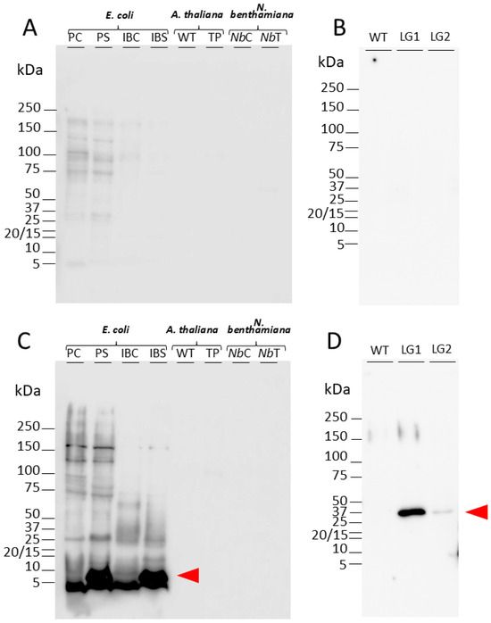 Western blot experiments were performed to test the specificity of anti-SST1. The total proteins and purified inclusion bodies from E. coli colonies with and without mSST1 production were assayed, along with protein extracted from Arabidopsis seedlings (WT, p35S::SST, and p35S::SST-GFP transgenic plants) and from N. benthamiana leaves (control and agroinfiltrated with the p35S::SST transgene in the pEAQ vector). The proteins from N. benthamiana leaves and A. thaliana seedlings were extracted according to [54]. Frozen material was homogenised in a RETSCH mixer mill (RETSCH, Haan, Germany) and 200 mg was resuspended in 400 µL of extraction buffer (50 mM Tris/HCl pH 8.0, 100 mM NaCl, 1 mM EDTA, 5 mM β-mercaptoethanol, 0.02% Triton-X-100 (Sigma-Aldrich, St. Louis, MO, USA)).