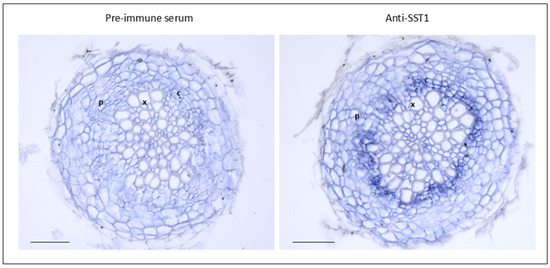 Immunocytochemical labelling was conducted in the basal zone of radicles of 25 d old seedlings of A. thaliana. Sample preparation and incubation with the antibodies were performed as described in [55]. Anti-SST1 and secondary antibody (goat anti-rabbit IgG conjugated with alkaline phosphatase) were applied at a 1:200 and 1:300 dilution, respectively. Once the colour reaction was visualised, sections were dehydrated in a graded ethanol series, dipped in xylene, and mounted in Entellan (Merck, Darmstadt, Germany). Controls were performed using pre-immune serum at 1:200.