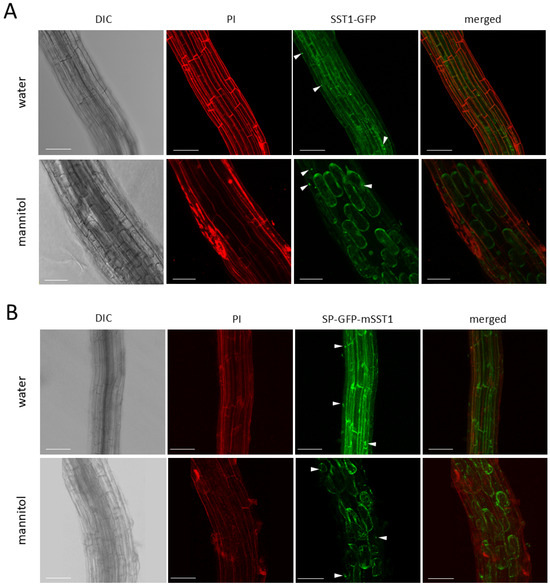 Roots of 20 to 25 d old T2 transgenic plants harbouring the SST1 CDS fused to GFP (p35S::SST1-GFP or p35S::SP-GFP-mSST1) were observed with a LEICA DMI-6000B microscope equipped with a confocal SP5 system. The cell plasmolysis and cell-wall staining were performed as described by [9].