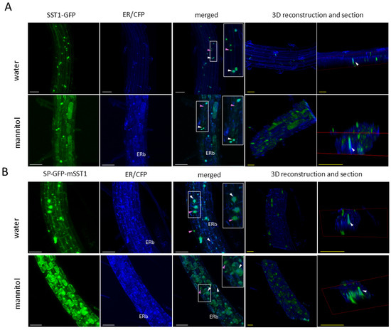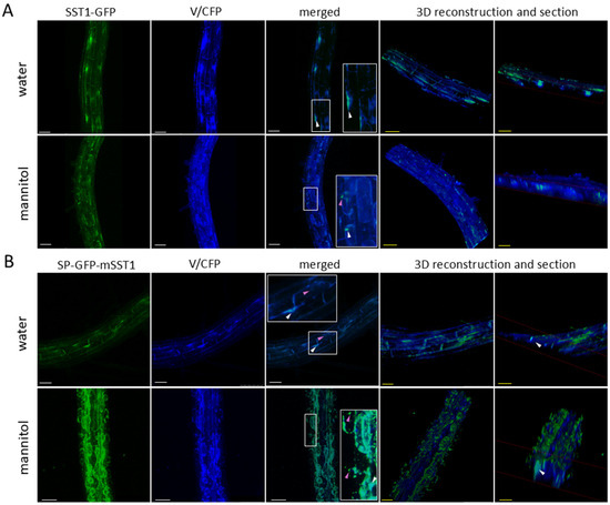 Similarly, we visualised the roots of the double-transgenic plants with the SST1 fused to GFP and the organelle protein markers tagged with CFP. Images were processed using ImageJ 1.54f/FIJI Software and 3D projections and sections were obtained with Leica LAS X 5.1.0 Software.