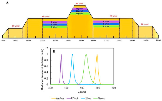 Experimental design performed in the Aralab Bioclimatic chamber. (A) Representative scheme of the experimental design containing the different radiation qualities and intensities. Amber was employed during the whole daily cycle and is represented by yellow color; meanwhile, complementary radiations are restricted to certain periods of the day and are represented by violet, (UV-A), Blue and Green. (B) Relative absorption spectrum of the lamps employed in the experiment.