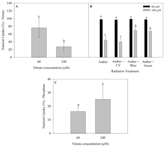 Nutrient uptake in Plocamium cartilagineum thalli cultivated under the influence of different treatments. (A) Nitrate uptake on day 7 from algae cultivated using different nitrate concentrations. (B) Nitrate uptake on day 14 from P. cartilagineum thalli cultivated under different radiation treatments and nitrate concentrations. (C) Phosphate uptake from P. cartilagineum thalli on day 14 using different nitrate concentrations. Different letters indicate significant differences among the treatments on days 7 and 14, independently.