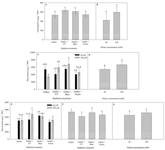Photosynthetic pigments determined in Plocamium cartilagineum thalli on the different experimental treatments. (A) Chlorophyll a content on algae thalli on day 7 influenced by radiation treatments. (B) Chlorophyll a content on algae thalli on day 14 influenced by nitrate concentration. (C) Phycoerythrin content on algae thalli on day 7 influenced by the interaction between radiation treatment and nitrate concentration. (D) Phycoerythrin content on algae thalli on day 14 influenced by nitrate concentration. (E) Phycocyanin content on algae thalli on day 7 influenced by the interaction between radiation treatment and nitrate concentration. (F) Phycocyanin content on algae thalli on day 14 influenced by radiation treatment. (G) Phycocyanin content on algae thalli on day 14 influenced by nitrate concentration, independently. Different letters indicate significant differences (p < 0.05) among the treatments at distinct times.