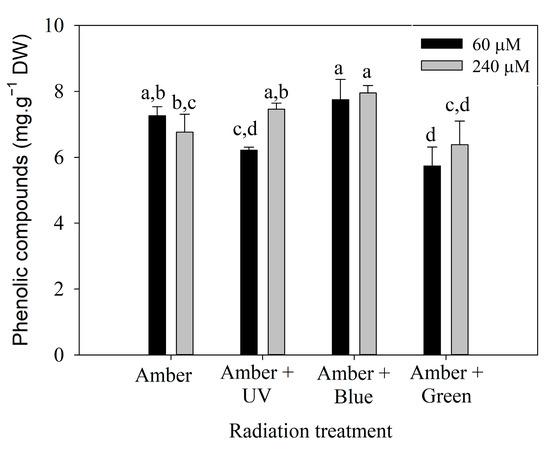 Phenolic compounds measured in Plocamium cartilagineum thalli on day 7 of the experiment resulted from the interaction between radiation treatment and nitrate concentration. Different letters indicate significant differences (p < 0.05) among the treatments.