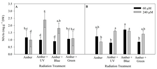 Total mycosporine-like amino acids on Plocamium cartilagineum thalli exposed to different treatments. (A) MAAs content on thalli at day 7, influenced by radiation treatment. (B) MAAs content on day 14, influenced by the interaction between radiation treatment and nitrate concentration. Different letters indicate significant differences (p < 0.05) among the treatments at distinct times.