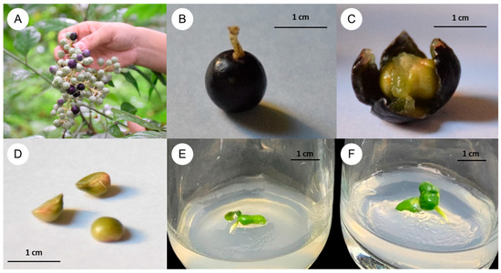 Effects of different disinfection methods on the seeds of C. lenis: (A–C) fresh mature fruits, (D) the seeds, (E) seedlings from seeds disinfected with 0.1% HgCl2, and (F) 0.2% HgCl2 for 20 min. after culture for 2 weeks.