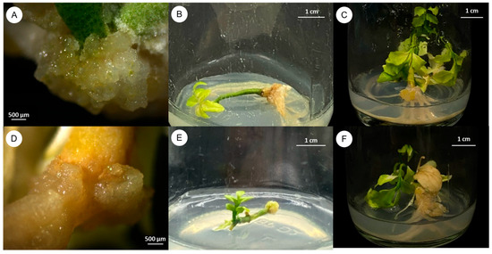 Effect of plant growth regulators on callus induction of C. lenis after culture for 3 months. (A) Seed explant cultured on MS with 0.5 mg/L 2,4-D, (B) stem with nodes explant cultured on MS with 0.5 mg/L 2,4-D, (C) 1-week-old shoot explant cultured on MS with 0.5 mg/L 2,4-D, (D) seed explant cultured on MS with 1.0 mg/L 2,4-D, (E) stem with nodes explant cultured on MS with 1.0 mg/L 2,4-D, and (F) 1-week-old shoot explant cultured on MS with 1.0 mg/L 2,4-D.