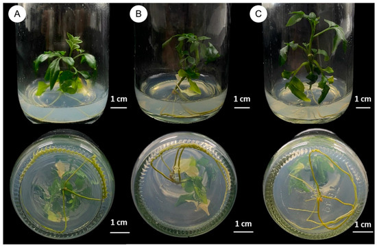 Effects of PGRs on root induction from shoot without shoot tip of C. lenis after culture for 6 weeks: (A) root induction on half-strength MS without PGRs, (B) root induction on half-strength MS with 12.0 mg/L IBA, and (C) root induction on half-strength MS with 20.0 mg/L IBA.