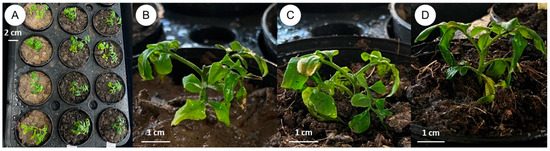 Plantlet acclimatization of C. lenis: (A) Plantlets with a well-developed root system are planted in small plastic pots filled with transplanting material on day one, (B) transplanted with sterile soil for 4 weeks, (C) transplanted with mixture of sterile soil and cocopeat (1:1) for 4 weeks, and (D) transplanted with mixture of sterile soil, cocopeat, and vermiculite (1:1:1) for 4 weeks.